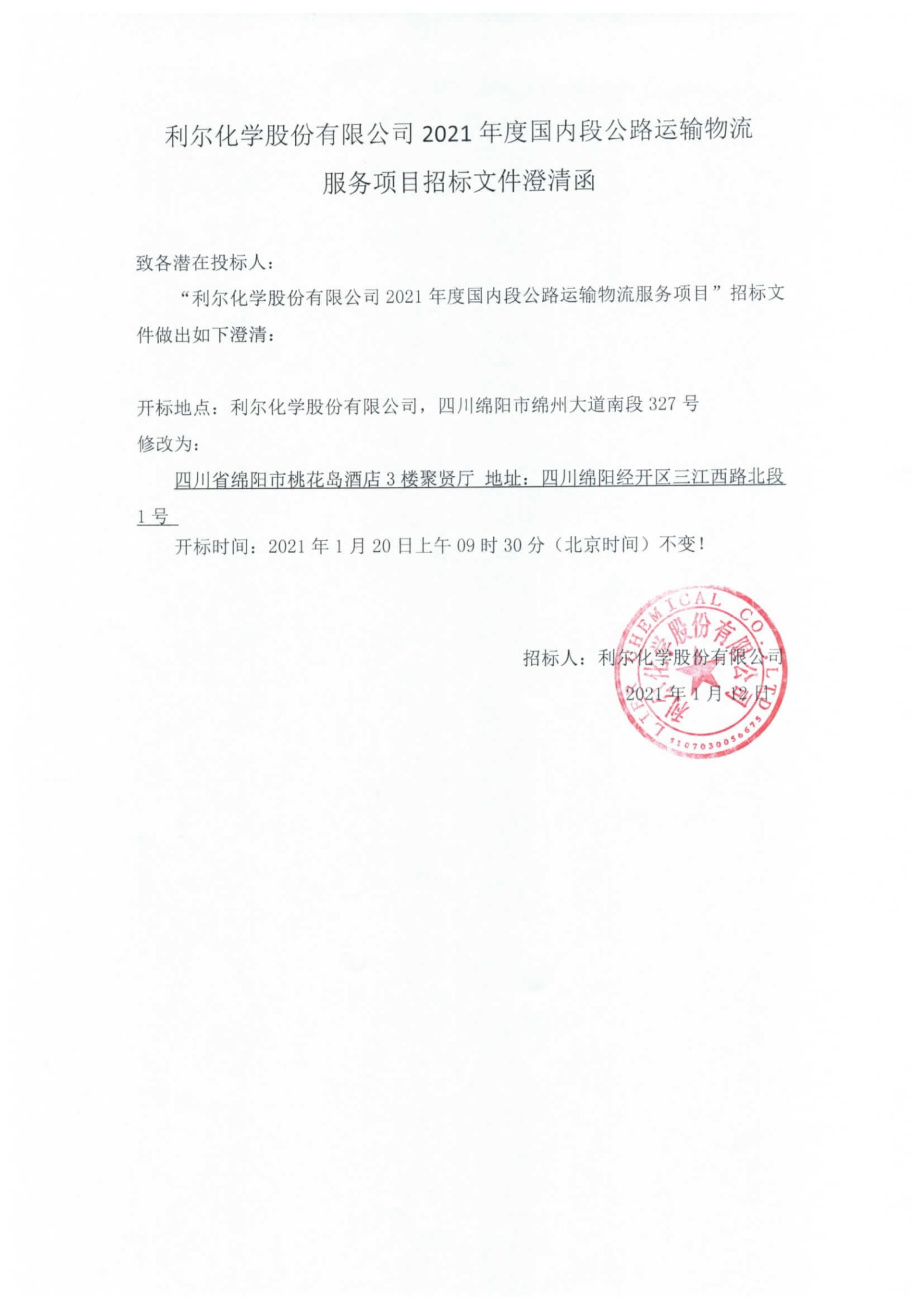 利爾化學(xué)股份有限公司2021年度國內(nèi)段公路運輸物流服務(wù)項目招標文件澄清函