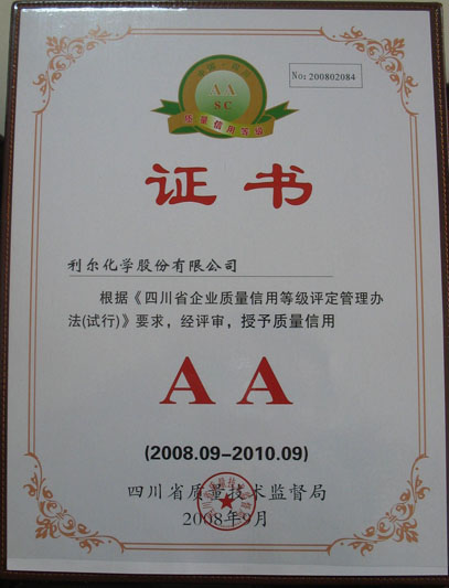 2008年9月,利爾化學(xué)股份有限公司被四川省質(zhì)量技術(shù)監(jiān)督局評為“二〇〇八年度四川省質(zhì)量管理先進企業(yè)...
